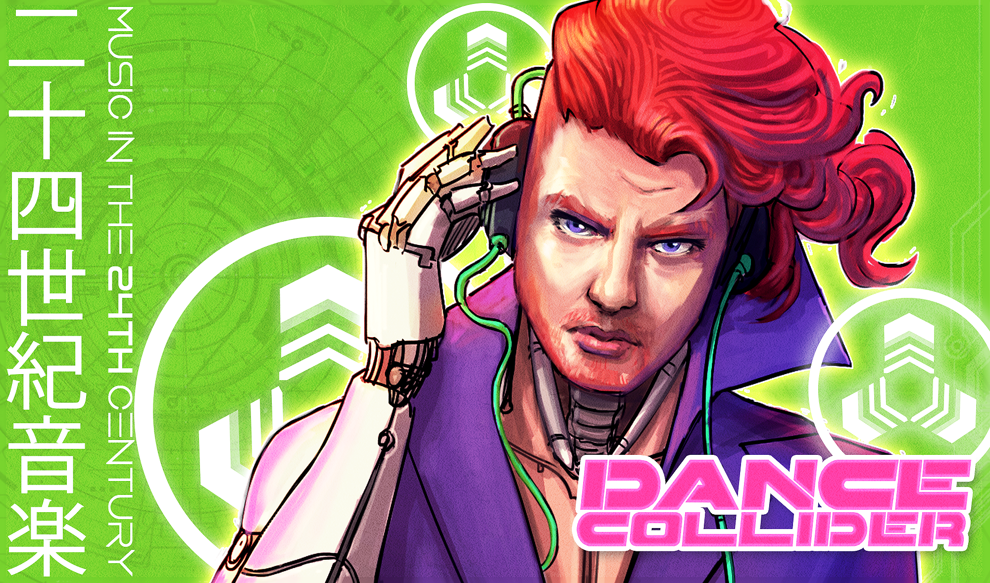 A funky, fashion-conscious girl from 24th century Tokyo seemed like a good start. Like all Dance Collider characters, Yuri is transhuman: an augmented human body with an augmented human mind. I wanted to suggest this through seams in her body and face separating the real from the manufactured. Her colour scheme contrasts vivid hues against a dark base: a metaphor for Tokyo itself :) Yuri’s dance style was to be pop with a hint of trance.